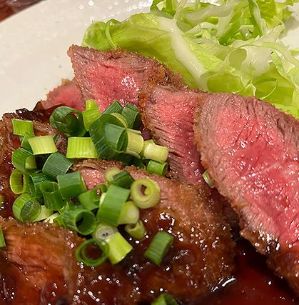牛一頭からわずかしか取れない希少部位「かいのみ」を使用した贅沢な牛カツ。ほぼ赤身ながら程よいサシで旨みが濃く、噛むほど肉の美味しさが広がります。注文ごとに180度の油で一気に揚げ、外はサクサク中はレアステーキのような仕上がりに。全国オーナーシェフが選ぶグルメコンテストで金賞を受賞した自慢の一皿です。